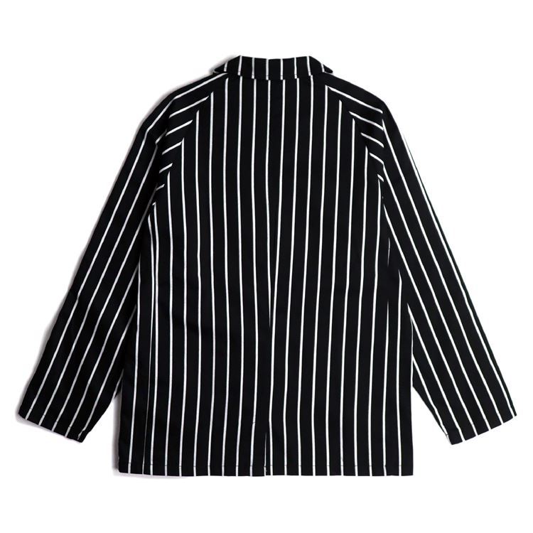 商品情報 商品名 Lab.Jacket Stripe素材 ポリエステル65%,コットン35%カラー BLACKサイズ M(着丈73cm,身幅53cm,裾幅54cm,肩幅43cm,袖丈63cm,アームホール52cm,袖口幅13cm)L(着丈77cm,身幅58cm,裾幅59cm,肩幅44cm,袖丈66cm,アームホール58cm,袖口幅14cm)ブランド説明 アメリカ西海岸の料理人仲間が集まり話しました。