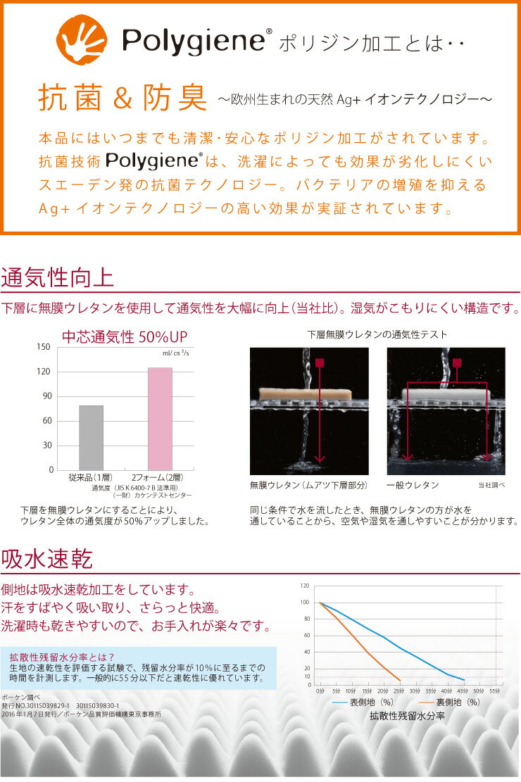 商品 ムアツ 2フォーム100(三つ折りタイプ) サイズ ダブル140cm(幅)×200cm(長さ)×9cm(厚み) 素材 中 材:ウレタンフォーム(二層構造) 側生地:ポリエステル100%(ポリジン加工 吸水速乾加工) ※取り外してご家庭でお洗濯が可能。