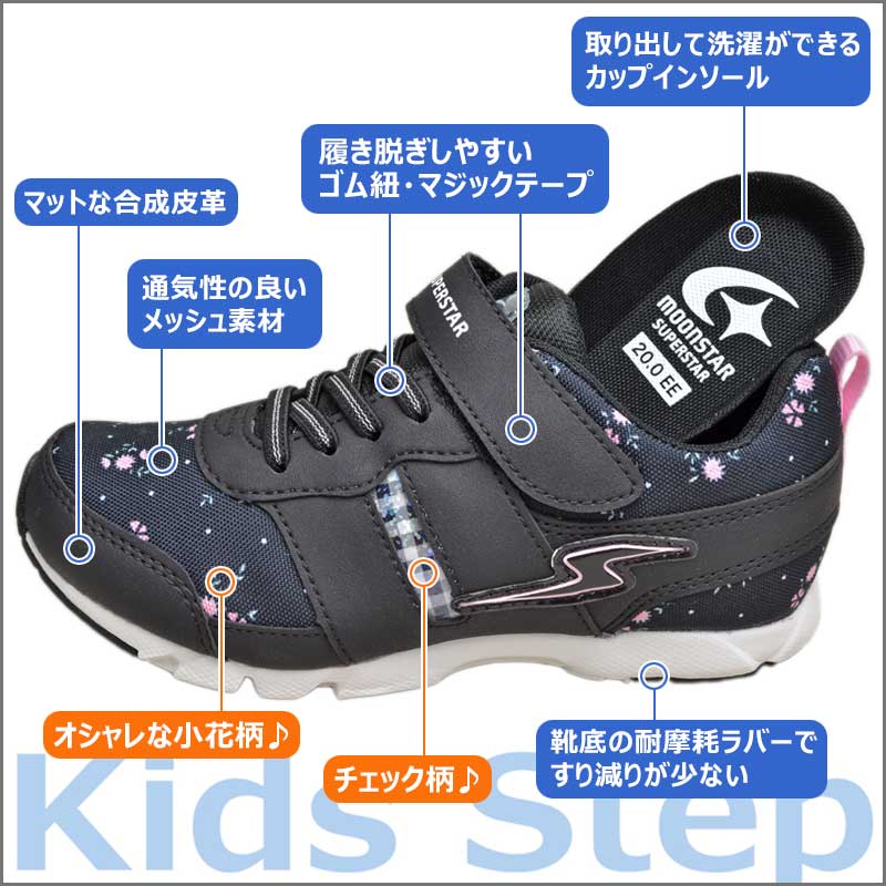 2021年 春の新作!ムーンスター バネのチカラ キッズ・ジュニア スニーカー ファンシーティントシリーズ 通気性のよいメッシュとかわいい花柄をプリントした合成皮革を使用した軽量のおしゃれなガールズ向けスニーカーです。